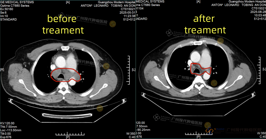 Sesuai dengan rencana pengobatan, Anton pertama-tama menjalani terapi intervensi, kemudian segera dilanjutkan dengan microwave ablation, terutama menargetkan lesi kelenjar getah bening metastasis di sisi kanan klavikula. Yang mengejutkan baginya, efek pengobatan muncul dengan cepat—beberapa hari setelah microwave ablation, ia sudah merasakan berkurangnya pembengkakan di area klavikula dan leher. “Sebelumnya, karena tumor di area klavikula, leher saya sangat bengkak hingga garis leher pun tidak terlihat. Setelah pengobatan, saat disentuh, benjolannya mengecil, dan garis leher mulai muncul kembali,” ujar Anton dengan gembira. [CT tumor di mediastinum sebelum dan sesudah] Yang lebih menggembirakan adalah hasil pemeriksaan lanjutan. Pemeriksaan CT menunjukkan bahwa kelenjar getah bening yang membesar di sisi kanan klavikula, kedua hilus paru, dan mediastinum terus mengecil, dengan ukuran kelenjar terbesar menyusut dari 35mm×27mm menjadi 17mm×23mm; volume total tumor berkurang sekitar 80%. Pemeriksaan penanda tumor juga kembali ke tingkat normal, menunjukkan bahwa kondisi penyakit telah terkendali dengan efektif.